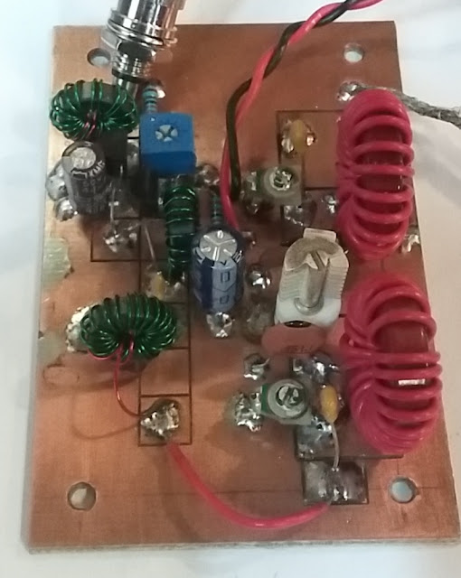 Above is the Simpleceiver Direct Conversion Receiver RF Amplifier (two J310's) and the Band Pass Filter. The BPF has cured the bleed through by the powerful AM shortwave stations operating above and below 7 and above 7.3 MHz.