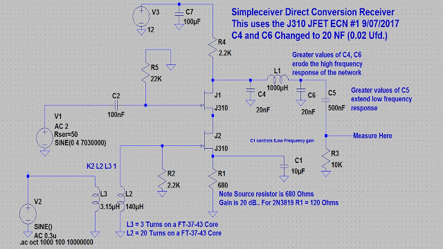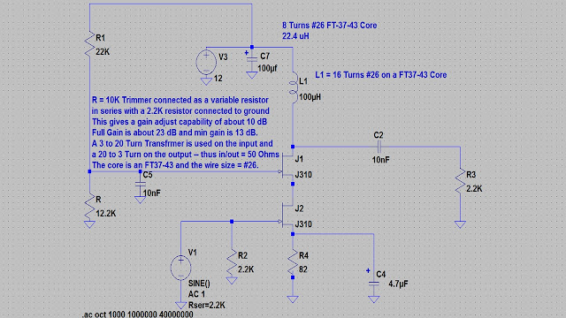 My plan is to try to use / reuse a common circuit in as many places as possible since that affords an opportunity to minimize the numbers of different parts used and a common building block enables/facilitates trouble shooting. That common building block is two J310s configured (mostly) as a Dual Gate MOSFET (DGM). I now have this common J310 DGM circuit element configured as a Microphone Amplifier, RF Amplifier, IF Amplifier, Oscillator, Mixer and Product Detector -- we are just getting started here. Along with this is the extensive use of LT Spice Simulation software (a free download from Linear Technology). Thus you have a solid technical basis for the design that has been simulated with known results and thus enables experimentation to evaluate circuit changes and improvements.