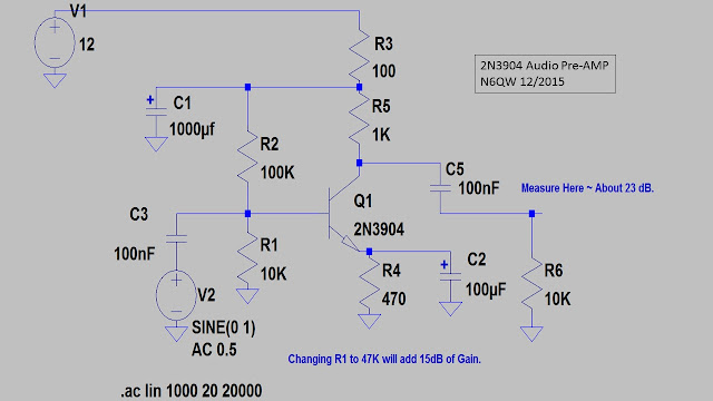 The first circuit shown below is one of the pre-amp stages and this has been simulated in LT Spice. Convince yourself by actually using the software and look at the results. I strongly recommend that builders do this simulation to learn the power of LT Spice.