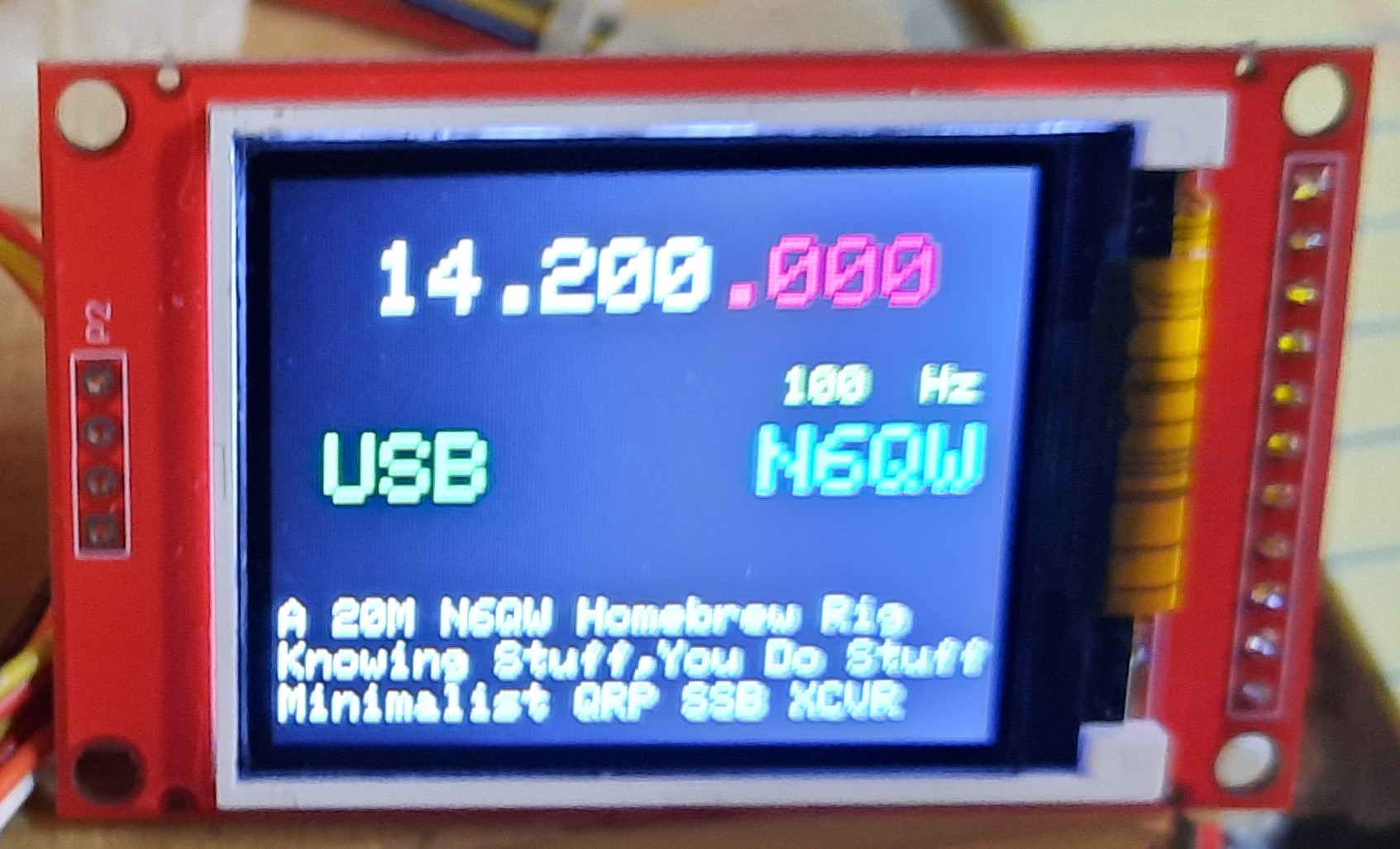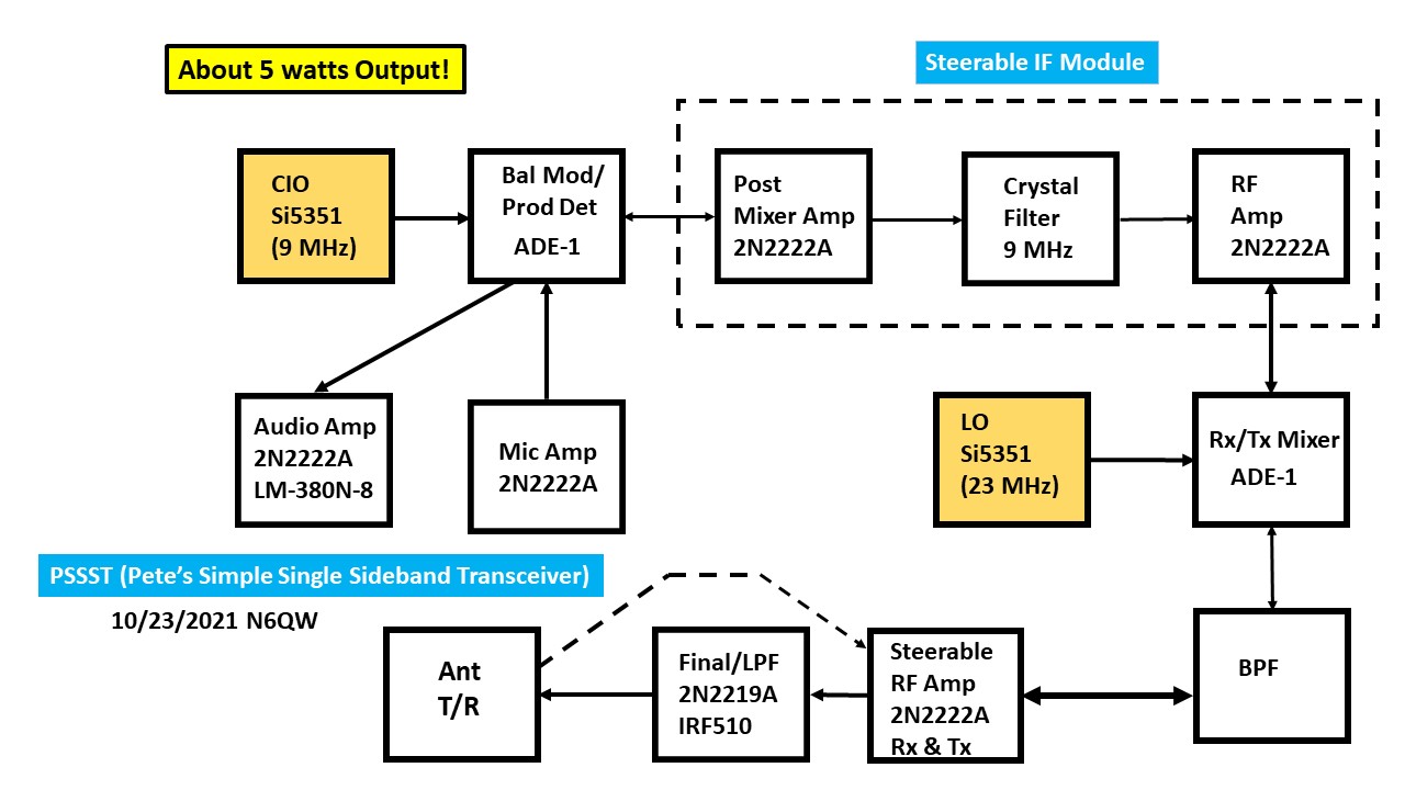 The PSSST started out with a 16X2 LCD and while we got creative we found having more real estate to display information was a huge bonus. The added icing to the cake ~ Color, lots of it. It also solved another issue. I noted with the LCD that the encoder would jump digits. That problems seems to be less with the Color TFT which perhaps says something in the code is the differential. The Wire List Link shows the Pin wiring to the Arduino and the Color TFT. Guys and Gals I am bristling a bit when I get emails asking if some cheapo display will work with this circuit. Like in the TV Commercials of Old I am NOT the Shell Answer Man. If you have a display then check the Pin out of your display to the wire list and that is you job NOT mine. Secondly my code uses the ST7735 Libraries. If you pick a Color TFT with the ILI9341 Code Set, then it is up to you to find the libraries and the wire correlation. Time to step up and figure out this stuff on your own. The capabilities of the Digital VFO includes selection of USB or LSB and various step tuning rates. Now embedded in the code is a selection of essentially two VFO's. I have set one so that start up is 14.2 MHz and the others is 14.074 Mhz. So at a flcik of a switch I check what is happening on FT-8 wihout having to tune down to that part of the band. But there is more to this functionality. If we use a DPDT switch we could use one half to control two different frequencies in two bands --such as either 40M or 20M. The other half of the switch could power on relays so that you would have a comparable BPF and LPF switched in line depending upon what band is chosen. The USB/LSB selection now has import especialy if cruising down to 40M SSB. So just with some embedded code and one DPDT switch we have a two band SSB transceiver. We are still using just 7 transistors. Bonus feature: TUNE Tone. Built is is a 10 second pulsed 988Hz tone that can be fed into the Microphone jack for tune up purposes. You won't find that in a BITX or QEX! There is no pad layout as Vector prototype board was used and the whole assembly was wire wrapped (this is digital not RF).
