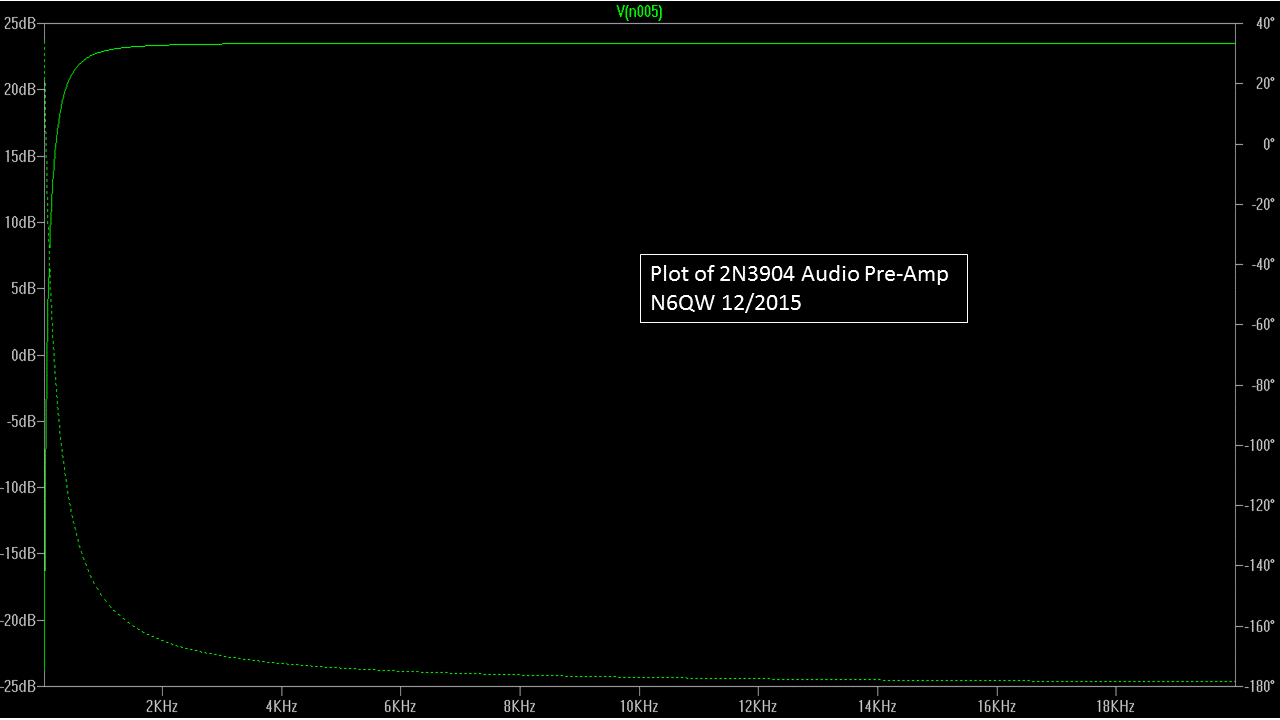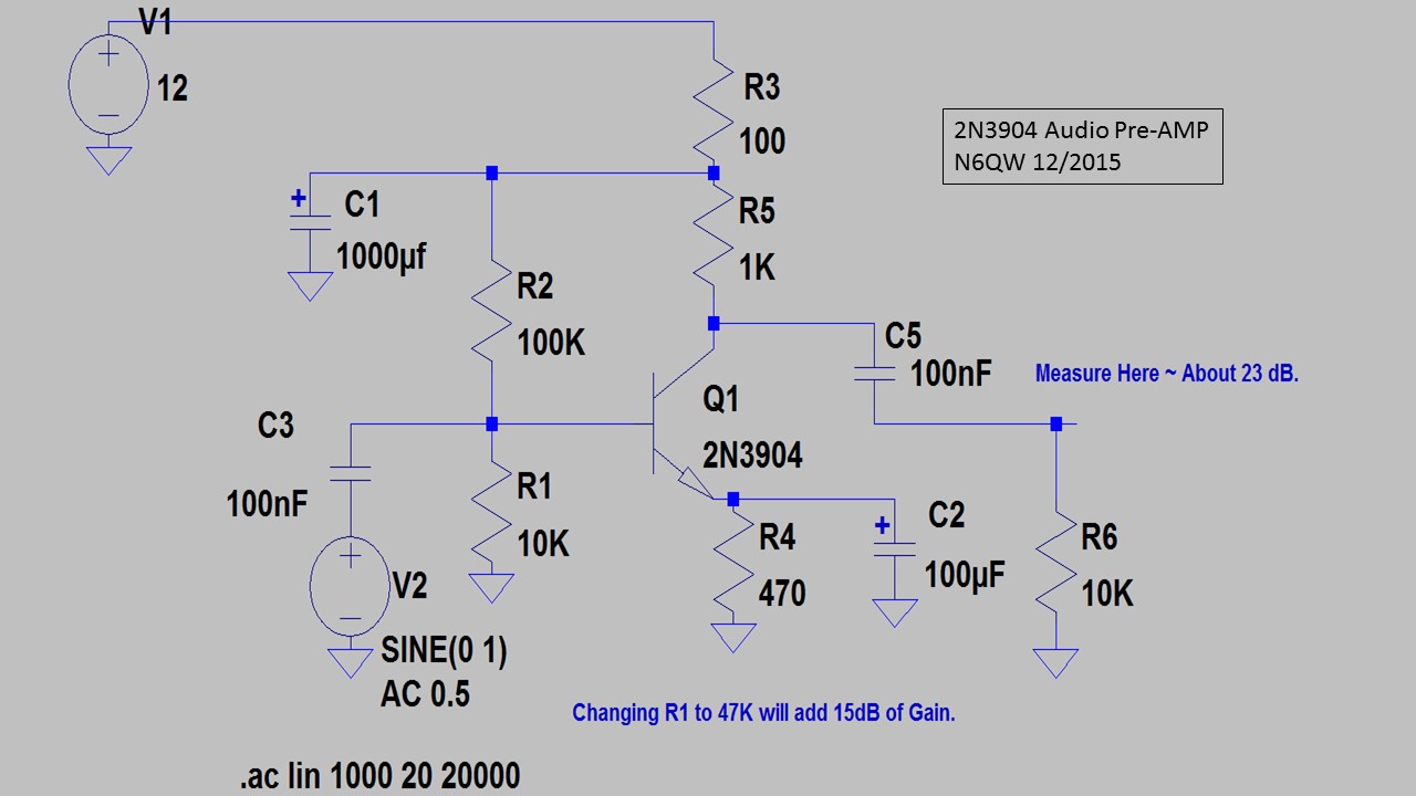 The first circuit shown below is one of the pre-amp stages and this has been simulated in LT Spice. Convince yourself by actually using the software and look at the results. I strongly recommend that builders do this simulation to learn the power of LT Spice.