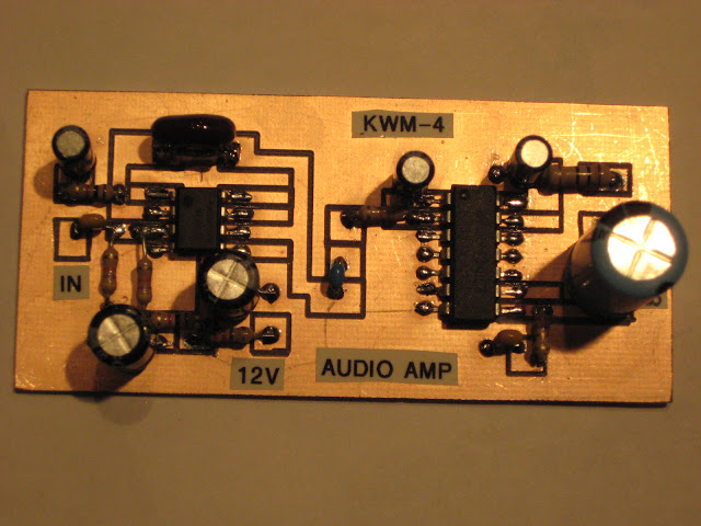 Our friend DuWayne, KV4QB, has been at it again and below is layout for a board that contains the Product Detector and the LM380 Audio Amp. DuWayne's approach is the Toner Transfer Method.