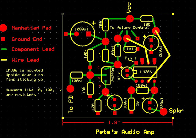 I see where Walter used one of the suggested techniques involving a piece of PC Board that is "grided" with 1/4 inch squares and then the MePads are glued down to the pads. Noteworthy is that using this method should you want to swap in an LM380 for the LM386 -- pretty easy to do.