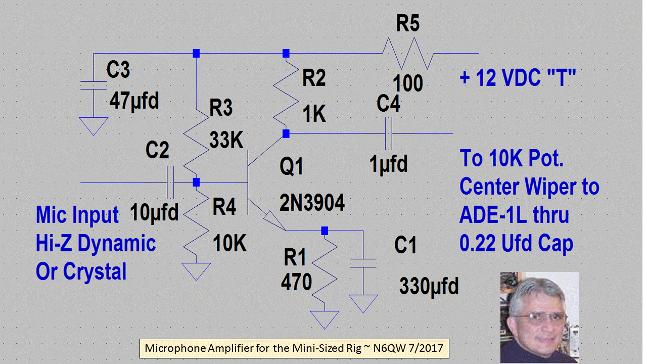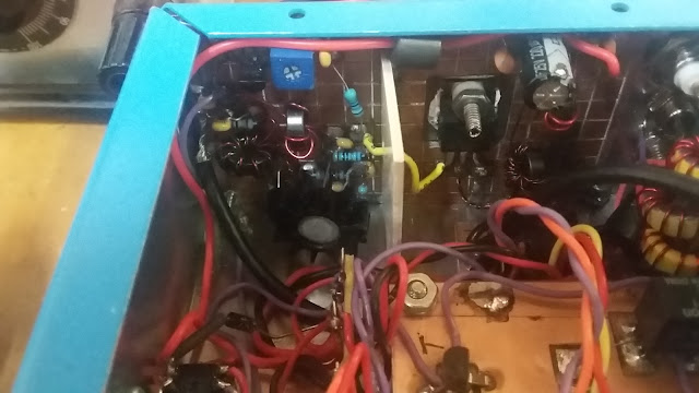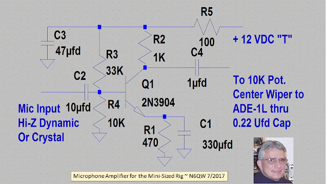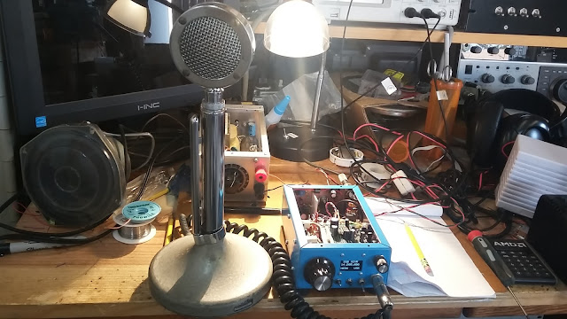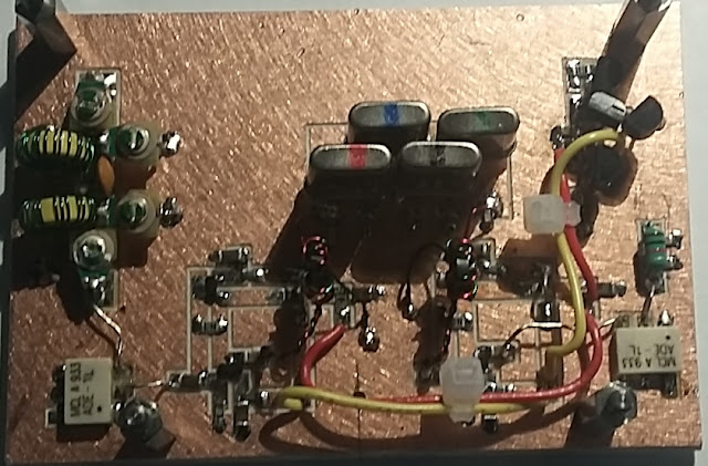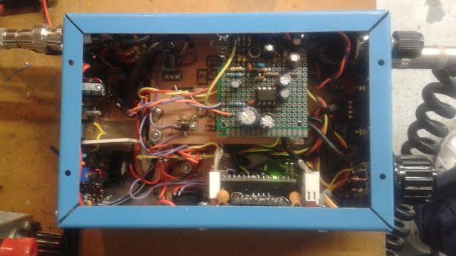 The next photo shows how the board was reworked and move slightly so all would fit back in the case. Note the use of the solder lugs to "collect" the board so it doesn't move and the add of the two smaller electrolytic capacitors so as the assemblies moved upward all of the boards would fit in the case. Some construction notes for this project. This is a really compact rig and even the install had to be sequenced so all circuits would fit in the enclosure and could be hooked up. Unless you have experience in building circuits in tight places, it is not recommend you replicate my approach. While the circuit pieces are modular, making them fit was a real challenge. One assembly consists of three stacked circuit boards with the bottom board being the IF, front end Mixer, PD/BM stages and the middle board is the MMIC bi-directional amplifiers and the top board is the Microphone and Audio Amplifier stages. The Driver and Final are on a separate board as is the Arduino. From the photo below you can see it is pretty jam packed into the enclosure. The OLED noise has not been an issue so check that box. BUT what has been a constant problem is the LEAD FREE SOLDER CRAP. That solder just does not stick and is a particular problem if you are using Manhattan construction. If you are doing ultrasonic wave soldering on 408 sized SMD parts --probably OK but not OK on an IRF510. Initially there was no output from the transmitter --yep a solder connection on the base of the 2N3866 just did not stick. You end up welding the parts and not flowing the solder. This new solder is real crap!!!!!! Mid July I did find some solder containing lead as that is still made in China and available on the Internet The proof is in the pudding and my new rig just completed its first contact with WA7ND, Rick up in Bend, OR. The report was excellent and I was running the small outboard amp so the Pout was >100 watts. Forget that QRP crap and just move on. I have had a second contact on the rig with KD5CO, Chuck in downtown Texas. I couldn't resist an additional test with the second contact --yep two after burners and the Pout > 600 watts into my two element beam. Now this can be a DX machine. So this is proof that the rig is more than a one hit wonder. On 7/11 I had a really great QSO with Jim, KA5BDO in New Mexico and he was very complimentary of how the rig sounded. He also suggested I use the Turner Dynamic Microphone for rag chews and the D-104 for DX chasing. You can see the new rig with the Turner Dynamic Microphone in the photo below. [That new rig IS small!] Just had a QSO with KH7XS, Bill out in Hawaii running 600 Watts -- another great report. This is a DX Machine in a mere 48 Cubic Inches. This is one superb rig and lest you forget --it is a DifX! I can't fully express the joy in putting this rig on the air and to have real QSO's with this diminutive sized box. One asks could there be more features? With a bit of more effort on packaging and the add of one DPDT toggle switch, two band operation would be possible. The only adds would be a second Band Pass Filter and a second Low Pass Filter and of course the toggle switch. If I replaced the MOX switch with a band switch then no more panel space would be required. A 40/20 Meter rig would cover the bases or maybe the 20/15 Meter bands or even a 20/10 Meter rig when the sunspots kick back up. Maybe even a 80/15 Meter rig would be your cup of tea. It is merely some code changes to the sketch. While it may not be possible for readers of this blog to build this project in a very tight space like this 48 cubic inch chassis box -- this is a worthy transceiver project that could be successfully built on an albeit larger scale (or box). That said the smallest SSB transceiver I have ever built was 33.3% the size of this rig --16 cubic inches. Virtually all of the circuits used in the rig have been previously published on this very blog (or articles in QRP Quarterly) so the module schematics are no mystery. If some one would like the Arduino sketch send me an email to the address on my QRZ.com page.