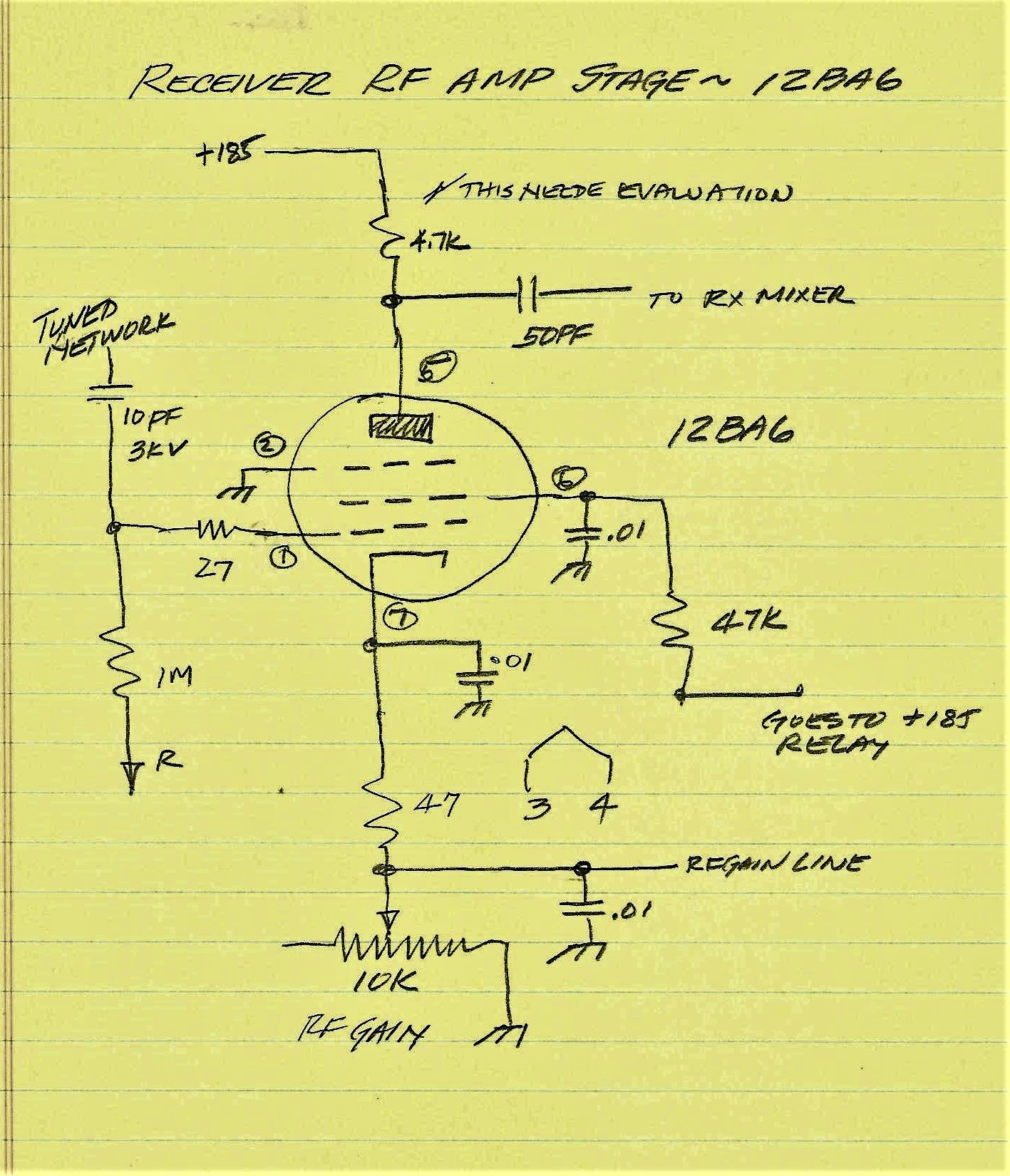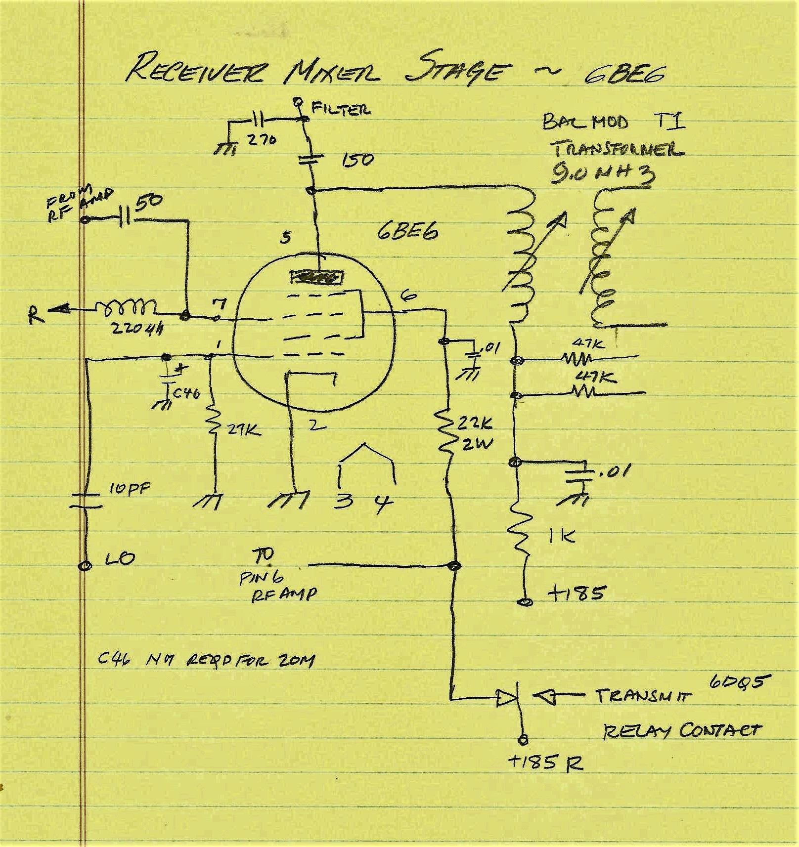 BTW in the initial Receiver testing the front end was DEAD. The problem was traced to a faulty relay and a failure to connect power . On receive +185 Volts is supplied via a Relay to the Screens of the Receiver RF Amp Tube (12BA6) and the Receiver Mixer Tube (6BE6). The relay pin was not making a good contact so no screen voltage no signal. There was also no plate voltage on the Receiver Mixer (6BE6). On the schematic the plate voltage to the 6BE6 was shown as a part of the 6JH8 circuitry. I had not hooked up power to the 6JH8 because I was only testing the Receiver. Fixing those issues sure made a big difference.