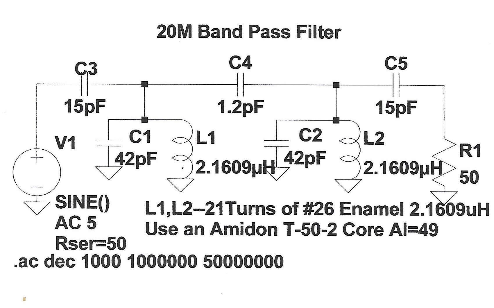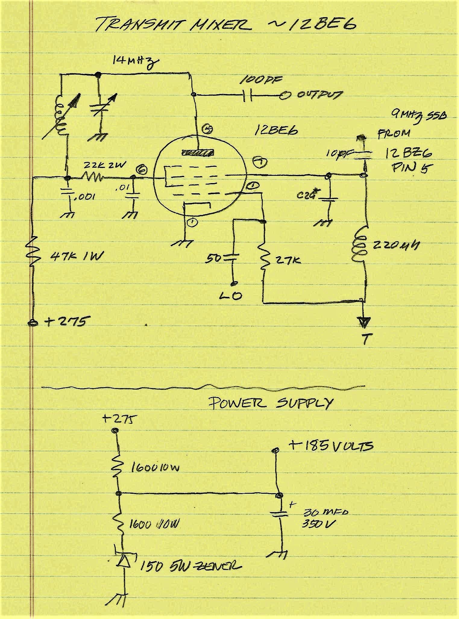 A bit of development work is needed for the Transmit and Receive Mixer stages. The Transmit Mixer Output in the Original SW-120 was gang tuned with the Driver Stage so that you picked off the "Plus" mixing product. I.E. 5 MHz SSB + 9 MHz LO. I am changing that to a simple RF Choke followed by a 20 Meter two stage BPF. In my Wireless no tuning required and we only get the Minus mixing product (LO Above the Operating Frequency). I figure a 1000 micro henry Choke should be in the Ball Park. The impedance is 89K at 14 MHz so in parallel with 50 Ohms the equivalent is 50 Ohms. We might need to do some fiddling with this, but I think it is viable. A similar approach was used with the Receive Mixer stage so essentially the RF Amplifier is connected to the Low Pass Filter (limiting some of the spectrum being received) with output fed to a 20M BPF inserted between the RF Amplifier Stage and the Receive Mixer Stage. The Band Pass Filter covers from about 14.050 to14.350 Mhz. Yes, this Wireless will do FT-8 but essentially skips CW. CW = "C" What? On receive in the SW-120, the input was connected to the Transmitter Tuned network and the resonance of the Transmitter stages put the Receiver in the right frequency range. My plan is is to use Band Pass Filters which should add a lot to front end selectivity and a cleaner transmit output. Again another "fiddle" point. It is OK for the Nay Sawyers to point out this is a single band design which it is. Adding band switching is a complex matter and my design approach is to focus on one band for simplicity. Those who are thinking 17Meters - don't - not with a 9 MHz IF, but 15M would be a good second choice to consider. Given that what I see about Cycle 25 forget 12 or 10 Meters. My observations are contrary to some scientists who think we will have a booming >200 SSN. It seems like the Left Coast has been Left Out of that pipe dream! A general comment at this point -- tubes and solid state are decidedly different technologies BUT the problems to implement these two technologies are like close 1st cousins. I find when doing the SS schtick I am always having to adapt some feature or function even extending to mechanical installations. Having those skills are the exact same approach when working with tubes (like my Balanced Modulator Transformer rebuild). We fiddle with tube circuits just like we fiddle with solid state circuits!