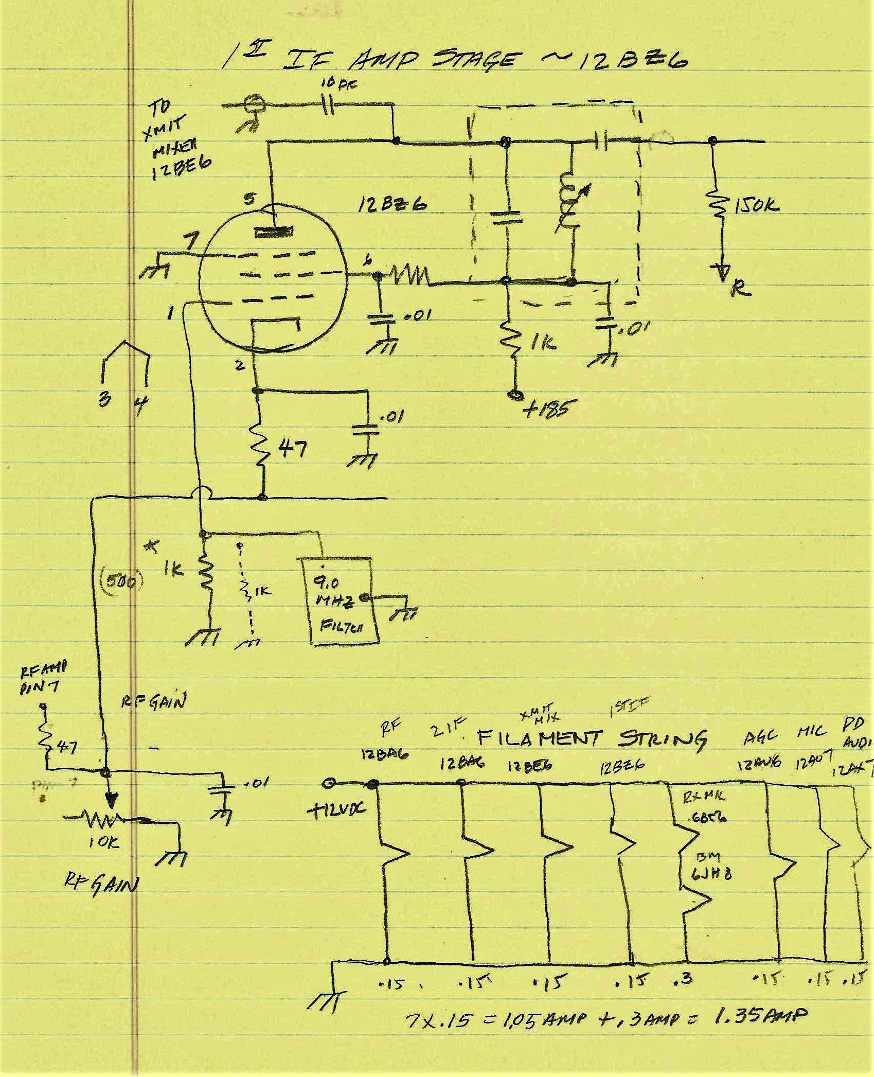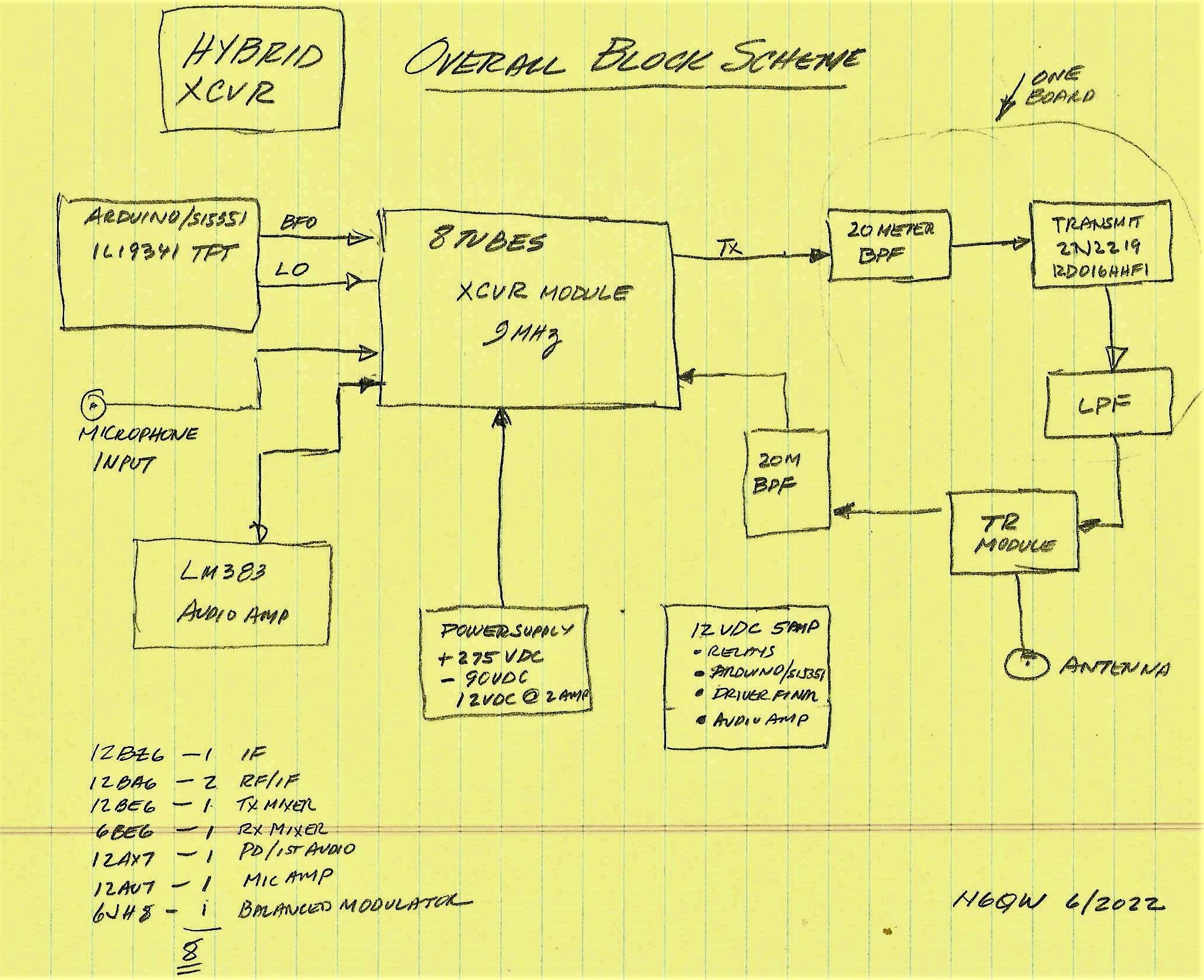 But first a bit of discourse on why build any rig with tubes in the design. The answer is simple -- just to be different and to not be like others who only homebrew rigs that can trace their pedigree to a Bitx20, EMRFD, or built around TIA stages. In earnest, I want to prove using other mediums that a successful mostly tube SSB Transceiver can be built without being tethered to these overworked and often quoted designs (Bitx, EMRFD and TIA)! There are other reasons too and these include the availability of many of the tubes of old at cheap prices and even hulks of old rigs can be found at ham fests and on the auction sites for literally less than a tank of gas. Yes -- using old technology with a bit of modern magic a Wireless Set is born! While the roots of my Wireless lie in the Herb Johnson (W6QKI SK) Single Band Series 100 Transceivers of the early 1960's, there are many significant modifications that update the rig to 2022. (SW-175, SW-140 and the SW-120 comprised the Series 100) A bit of a word or two about the Series 100 Transceivers as manufactured by W6QKI. Firstly it was an amazing product that enabled many hams in the early 1960's to get on SSB without spending 3X the cost of a Collins KWM-1. SSB rigs for the masses as at price you could afford -- what a concept! It was a simple design that got you there, but did cut a few corners in doing so. For one the sensitivity was not what we see today nor what was available in much more expensive radios. The other issue was the use of a rudimentary 4 pole Crystal Filter. The filter bandwidth was likely a bit wide and the pass band ripple much like an adolescent boy with terrible acne -- lots of bumps and not as smooth as a baby's bottom side. My "wireless" will have a better crystal filter and perhaps a better sensitivity based on not using the Pi Network Tank as a front end. Let's face it when using such an approach there is a compromise in that we always shoot for maximum power output which may not be the same point for maximum sensitivity. The SBE-33 Transceiver comes to mind where you make that same compromise between Power Output and Peak Signals. My design will have a Band Pass Filter on the very Front End of the Receiver and a similar BPF following the Transmit Mixer Stage. In a later version of the Series 100 a Tone Oscillator was incorporated into the design versus the earlier approach of simply unbalancing the 7360 Balanced Modulator tube. The 12AV6 (Tone Osc) approach used a DPST panel switch where 1/2 of the switch is connected between the 12AV6 Cathode to Ground (on state) and the other 1/2 tripped the PTT. This is a typical Herb Johnson approach in that some radios that were on the line being built as per the original design but had the Tone Oscillator installed. In some of the Series 100 transceivers the tone oscillator was fitted to a small L Bracket that was mounted underneath the chassis -- sort of stuffed into the wiring. Great idea Herb! Using a bit of modern magic a SPST switch connected to the Arduino inputs a signal where on the TFT Display it says "TUNE" while simultaneously making a Pin HIGH to close a DPDT relay which will "On" the 12AV6 and trip the PTT. If the availability of Arduino Pins was a concern then a DPST switch could simply input to the Arduino (1/2 the Switch) while the other half controls the relay. A discussion of homebrew "valve" SSB Transmitters and Transceivers would not be complete without a "Tip of the Cap" to Mike KG7TR who is not only a master craftsman but has produced some really stunning looking rigs. Visit Mike here Please refrain from comparing my pile of junk to anything Mike has built -- he has knack extraordinary!