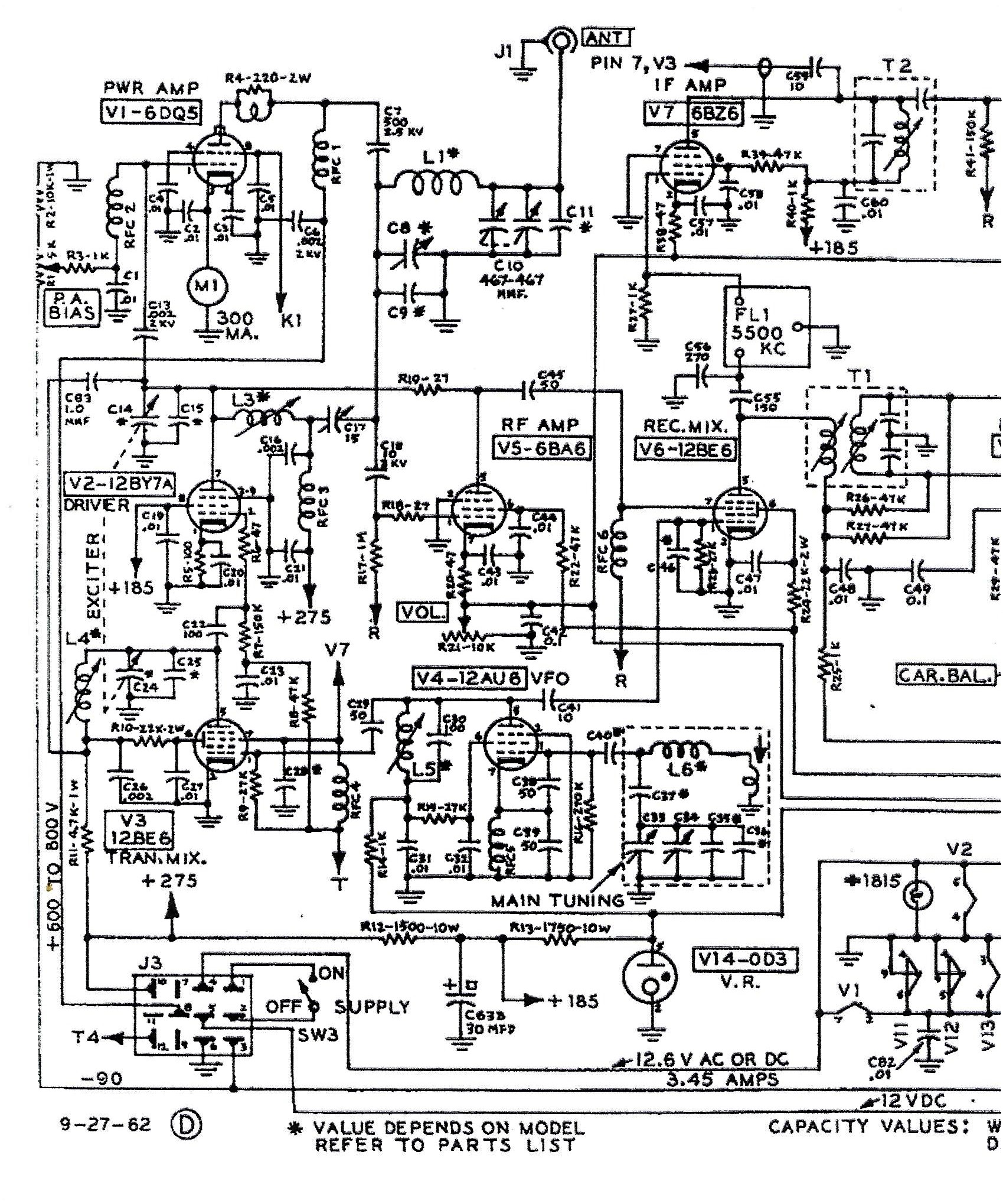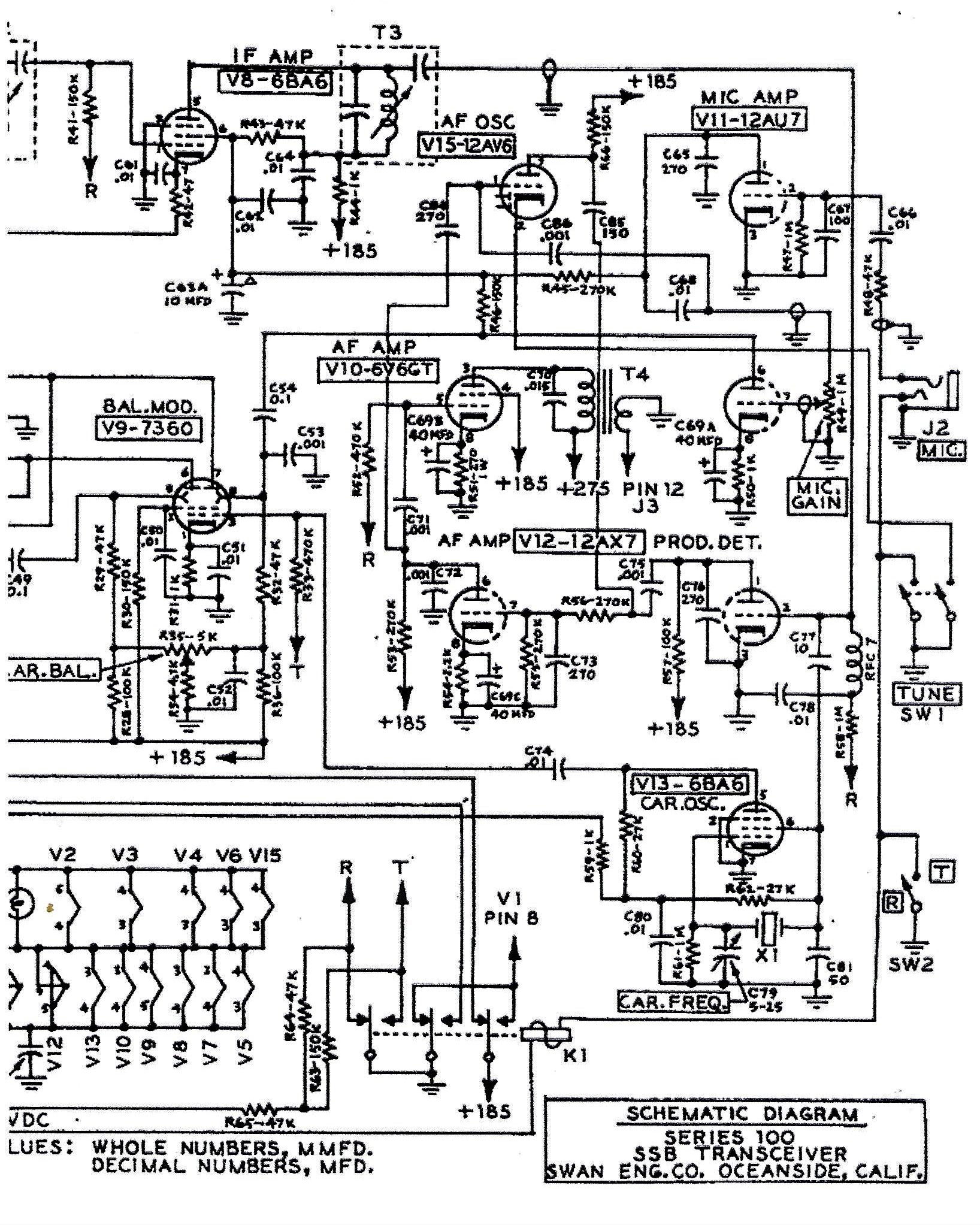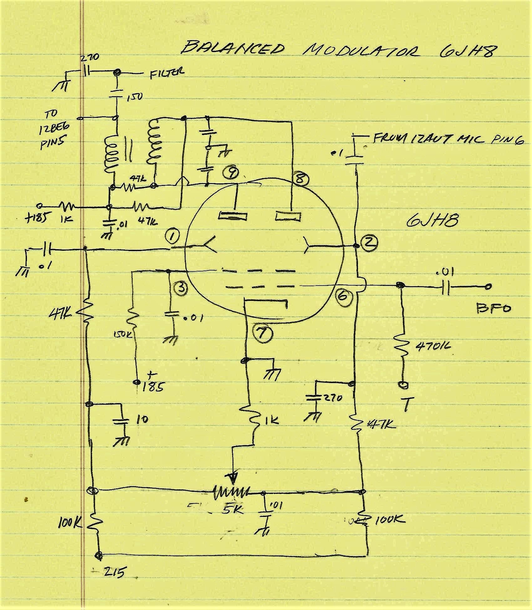 The Architecture of the 1950's -1970's tube rigs was not unlike a follow the sheep approach of the day (similar at that time to Bitx20, EMRFD and TIA) where most of the designs had a 12AU7 Microphone Amp, a 12AX7 Product Detector, A 12BZ6 in the IF chain, 6BE6 or 12BE6 as the Mixer stage and of course 6BA6 or 12BA6's in the RF/IF stages. The Audio stage had a 6V6 or 6AQ5 or like Heath and Collins a 6EB8. For a Balanced Modulator either a Diode Ring with Germanium Diodes (1N34 or 1N60) or tubes such as the Sheet Beam variety like the RCA 7360 or GE 6JH8 or 6AR8. The 7360 got to be very expensive so many radio manufacturers switched to the less expensive GE types (6JH8 or 6AR8). Swan made the switch in later radios like the 350 and 500. Even today that is the case with the price of these tubes. A 7360 may fetch $50 whereas the 6JH8 can be found for under $10. A note in history, GE was a major stock holder of RCA and both produced vacuum tubes! [In 1919 the US Navy gathered AT&T, United Fruit Company (UFCO now Chiquita Banana), GE and Westinghouse to form RCA with GE as the major stockholder. In 1926 RCA bought a radio station from AT&T and created NBC. One might ask why Chiquita Banana was in the radio business -- simple it was a technology tool needed for the conduct of the banana trade! UFCO had an extensive investment in radio stations, technology and shipboard equipment. The US Navy caused this action because of national security issues seeing as much of the early high power radio gear was made off shore and WWI demonstrated a huge vulnerability. See the earlier link to the US Navy. ]